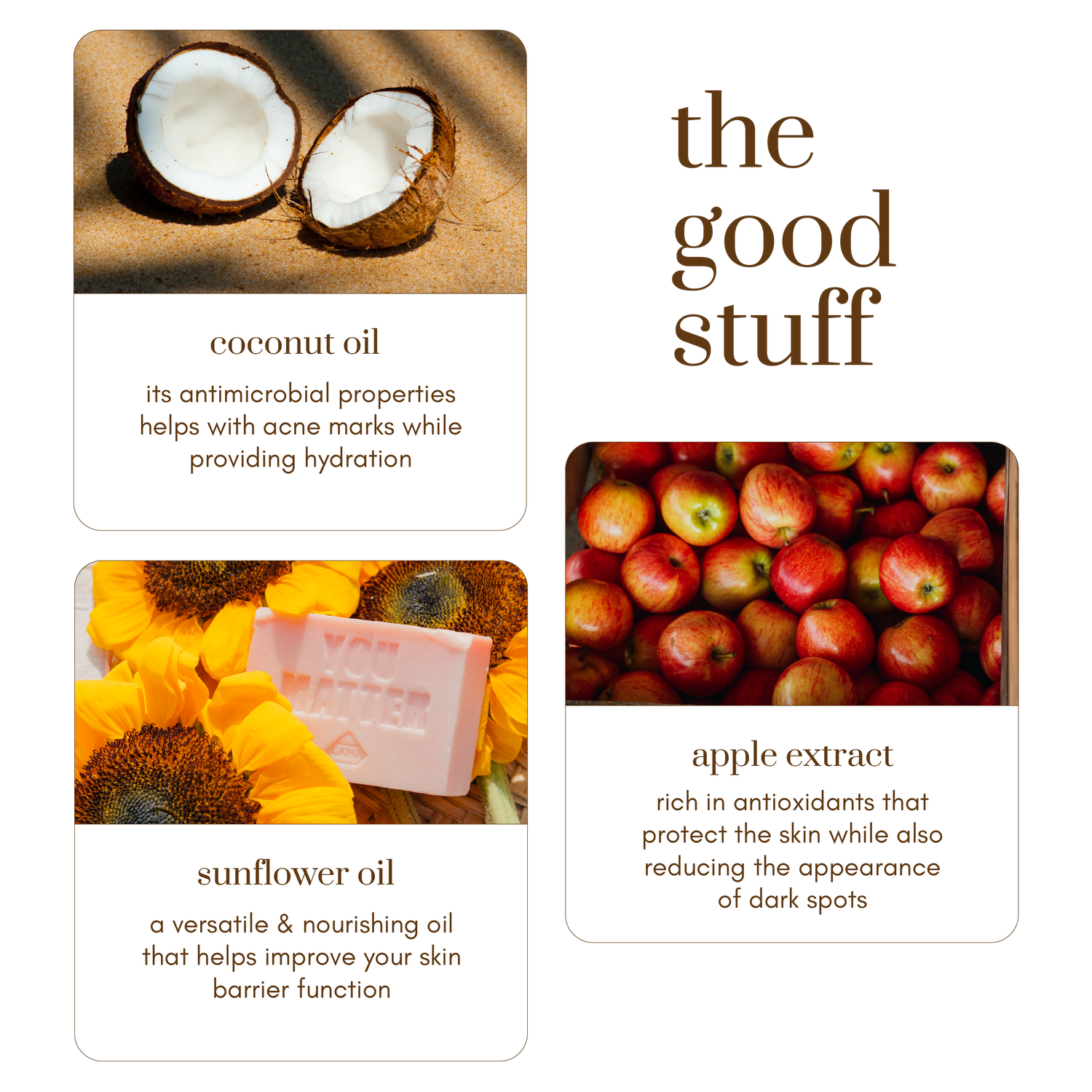 Cocos nucifera(Coconut)Oil, Sodium Hydroxide, Aqua, Glycerin, Caprylic/Capric Triglyceride, Niacinamide, Sodium Lactate, Titanium Dioxide (CI 77891), Carica Papaya (Papaya) Fruit Extract, Helianthus annuus (Sunflower) Seed Oil, Lactic Acid, Morus alba root (Mulberry) extract, Phenoxyethanol, Pyrus Malus (Apple) Fruit Extract, Parfum, Kojic Acid, Citric Acid, CI 45430